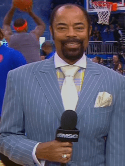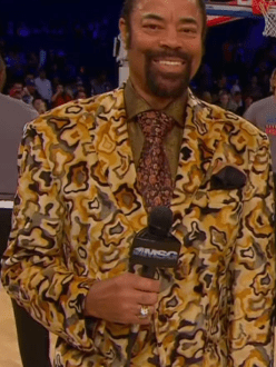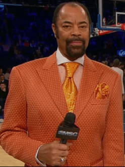 11/29/15 – Knicks vs. Houston Rockets Clyde welcomes Harden to The Garden with this fly orange ensemble! I’m a sucker for an orange suit and this is the Living Legend’s third different one of the season! Suit: Orange with White dots Shirt: Light Orange Tie: Orange Grade: A