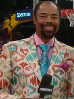 1/8/19 – Knicks @ Golden State Warriors Slicing, dicing and enticing! Clyde’s fly suit is cray for tonight’s game in the Bay against Steph and Klay! Suit: Black and Silver Shirt: Black Tie: Gray and White No bonus points for the boring gray pants not shown on TV. Grade: A