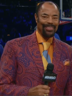 10/3/17 – Knicks vs. Brooklyn Nets The Living Legend is percolating in paisley! It’s great to be back celebrating the flyest Knick with the knack! Suit: Maroon and Purple Paisley Shirt: Orange Tie: Blue and Orange Stripes Bonus points for the orange pants, shoes and briefcase not shown on TV. Grade: A